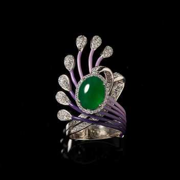 翡翠因此雖有著千萬年歲月累積的沈靜,卻展現了活潑的生命力。同一件翡翠,隨著欣賞者的心情、當時的光線和環境,它會有不同的表情和意境。所以,以翡翠為主材設計作品,設計者必須對翡翠這樣的特質有一定的了解,知道怎麼安排它,讓它展現這樣的魅力,才能設計出精采的作品。