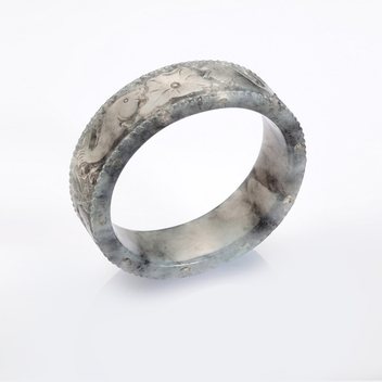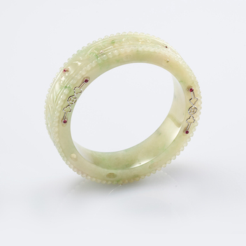 雕刻類的手鐲,別有一番古雅的氣韻,鐲面的紋飾主題,也隱含著它特有的祝福意蘊。製作雕刻類手鐲,需要熟稔的手藝工夫,因為要在一個寬度有限的圓面上進行雕刻,而且施作的那些主題元素的線條或形狀又不能扭曲變調,這是很不容易的工序過程。