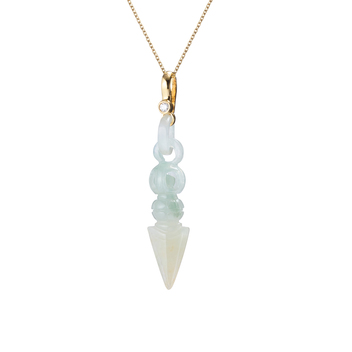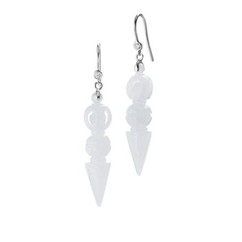 坊間可見此類配飾,多為銀製。【神行智慧】系列,則採用翠玉雕作,珍貴的翡翠,硬度甚高,雕琢不易,作玉者結合圓雕以及透雕等玉作手藝,呈現出玉環、蓮華、錐狀物之造型,比例合度,層次分明,工法細膩,再襯以鑽飾,透顯人文底蘊與時尚魅力。