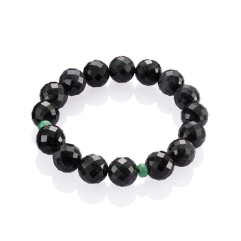 墨玉質色,含藏著幽邃光澤,作玉者將其細細琢磨,化作光素圓珠,連綴成串,其間,再襯以紅翡或綠翠,甚是吸睛,而紅翡綠翠,或以圓珠形制,或刻以葫蘆紋樣;亦有在圓珠表面施以菱格紋切割的款式,圓珠切面,猶似人間的萬千面目。
