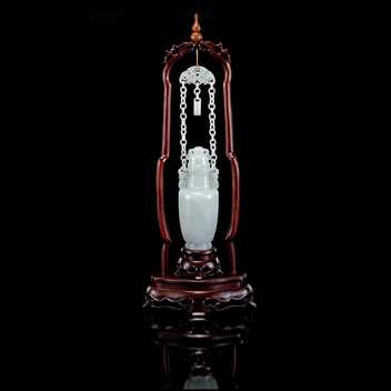 而翡翠玉瓶,該連環提梁的玉作過程,極為耗時、費工,環與環的銜接,乃至於與瓶身之間的聯繫與比例,皆是在一塊原石上經過仔細設計、琢磨而成,其玉質之美,工藝之精,堪為精彩之作。此外,瓶與「平」同音,以此延伸出「平平安安」的題旨;又因作品中的連環提梁,更蘊含著此份「平平安安」有了「連綿不絕」的意蘊。