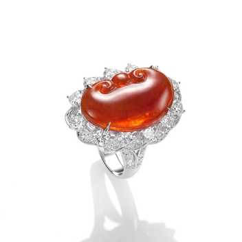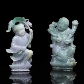 翡翠玉質,溫瑩清潤,翠色舒雅,點染化外之境的靜謐。琢為雙鶴,引頸相對,倆倆銜如意,鶴,向為長壽之徵,如意,寄寓萬事如意,既得福壽綿延、如意永享之兆,人生便是自在無憂。
