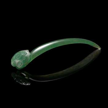 此柄玉如意,有深邃的高雅翠色,柄首處,巧琢桃實、佛手與石榴,桃實添壽,佛手增福,石榴多子,一柄玉如意,即能達致三多永庇佑的大福氣!再觀作工細節,柄首雕琢精緻,柄身線條優美,透雕與保留部分石皮的設計手法,愈益顯其歲月裡的精華之美。
