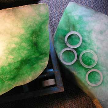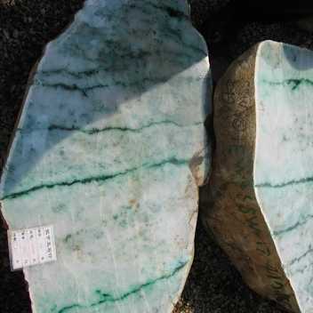 開石之後,翡翠玉料的面目更加清楚,此時,得以進一步針對翡翠顏色的濃深明暗、透光性的高低、裂紋或雜質的分佈,以及該玉料將製作為何種器形(珠寶首飾或藝術雕件)等因素,進行更細部的「切片」。