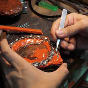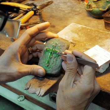 不論是珠寶首飾或藝術擺件,經由此道雕琢的工序,便能成「器」。將切形之後的翡翠玉料,透過不同尺寸、形制的磨輪,將珠寶首飾之形,以及藝術擺件主題裡的佈局與細節,包括神佛面目、人物姿態、花鳥蟲魚、亭臺樓閣等,依玉料上的畫樣,由粗形到細部線條,在琢琢磨磨的過程中,翡翠玉料即能成為霧面粗胚的半成品。