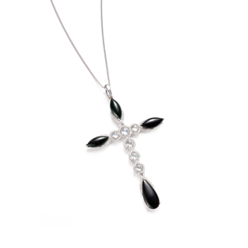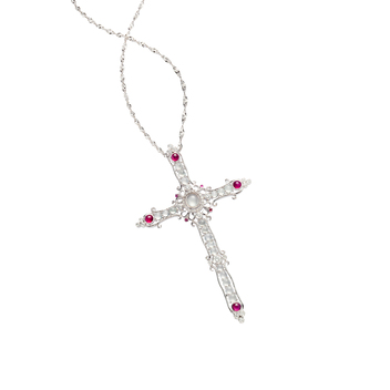 翡翠珠寶,以「十字架」為主題,設計為簡潔俐落的造型墜鍊,於十字形的墜身處,鑲嵌著綠翠、白翡、墨翠或紅翡,翠色的瑰麗多彩,輔襯著燦亮的鑽飾或異材質珠寶,透顯著優雅氣韻。