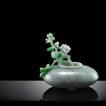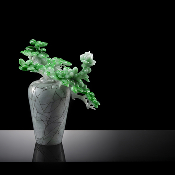該系列作品,以溫潤翡翠琢製而成,風格甚為巧致,瓶身開片,獨具古典氣韻,花葉枝椏,舒展自然,透現歲月靜好之美。