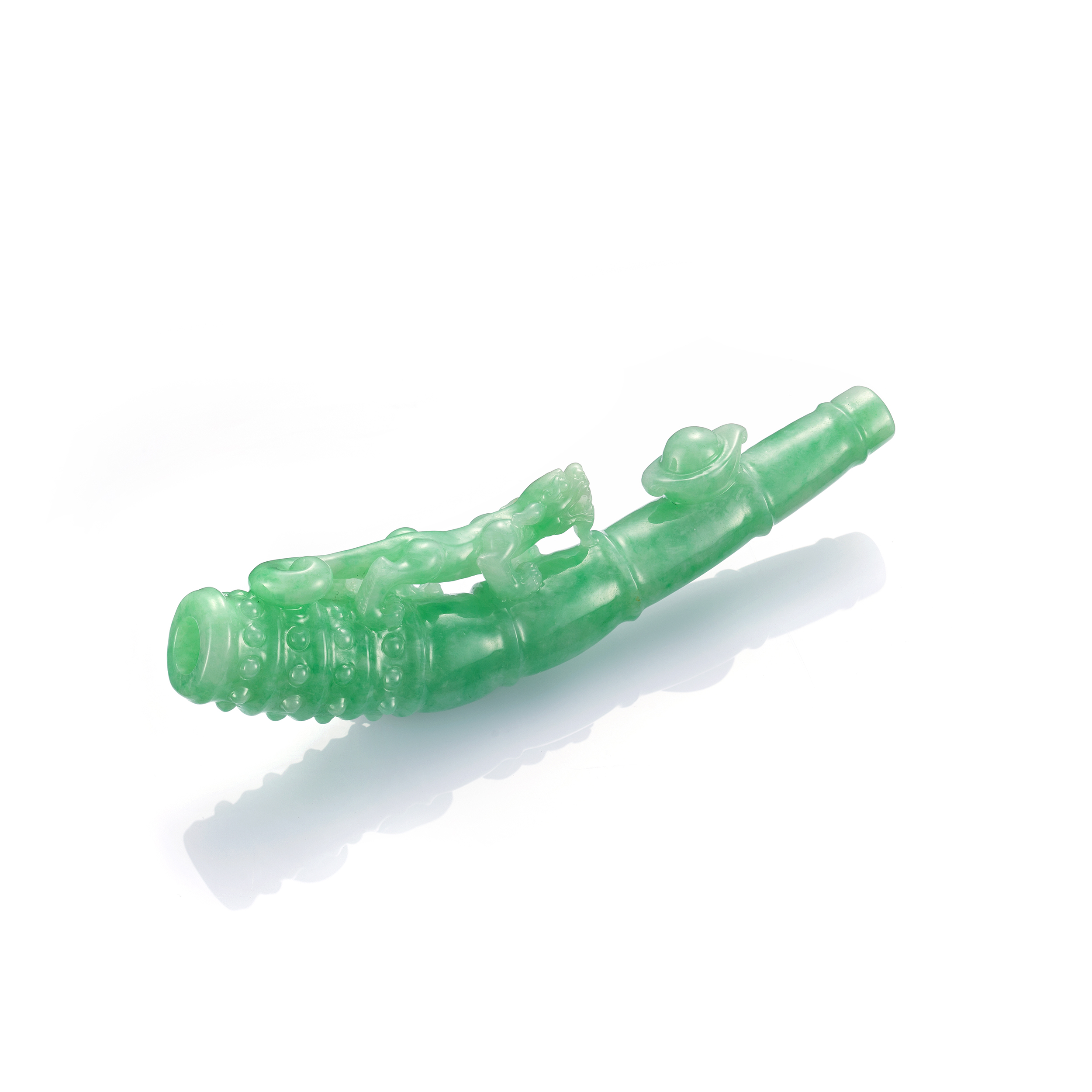 翡翠菸嘴,以珍貴玉材琢製而成,溫潤質地,變化無窮的玉色,使它超越了實用功能,成為兼具文化意涵與美學特色的文玩和飾品。