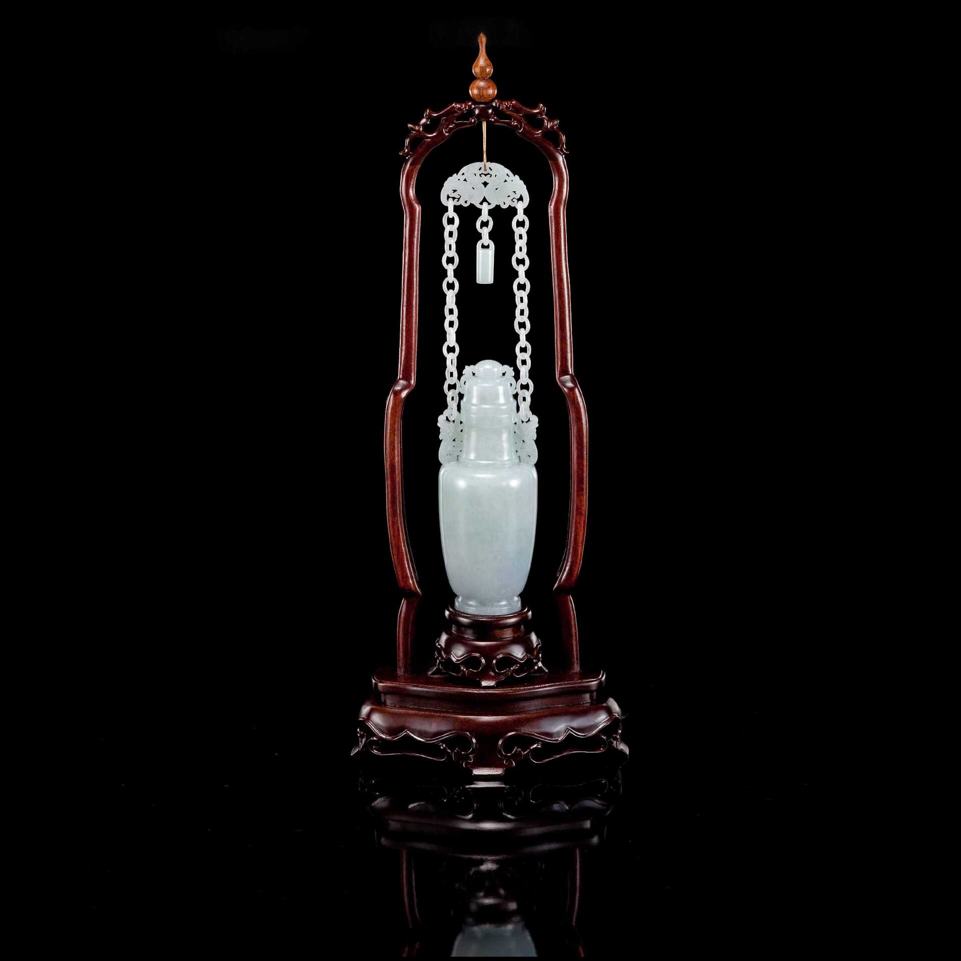 而翡翠玉瓶,該連環提梁的玉作過程,極為耗時、費工,環與環的銜接,乃至於與瓶身之間的聯繫與比例,皆是在一塊原石上經過仔細設計、琢磨而成,其玉質之美,工藝之精,堪為精彩之作。此外,瓶與「平」同音,以此延伸出「平平安安」的題旨;又因作品中的連環提梁,更蘊含著此份「平平安安」有了「連綿不絕」的意蘊。