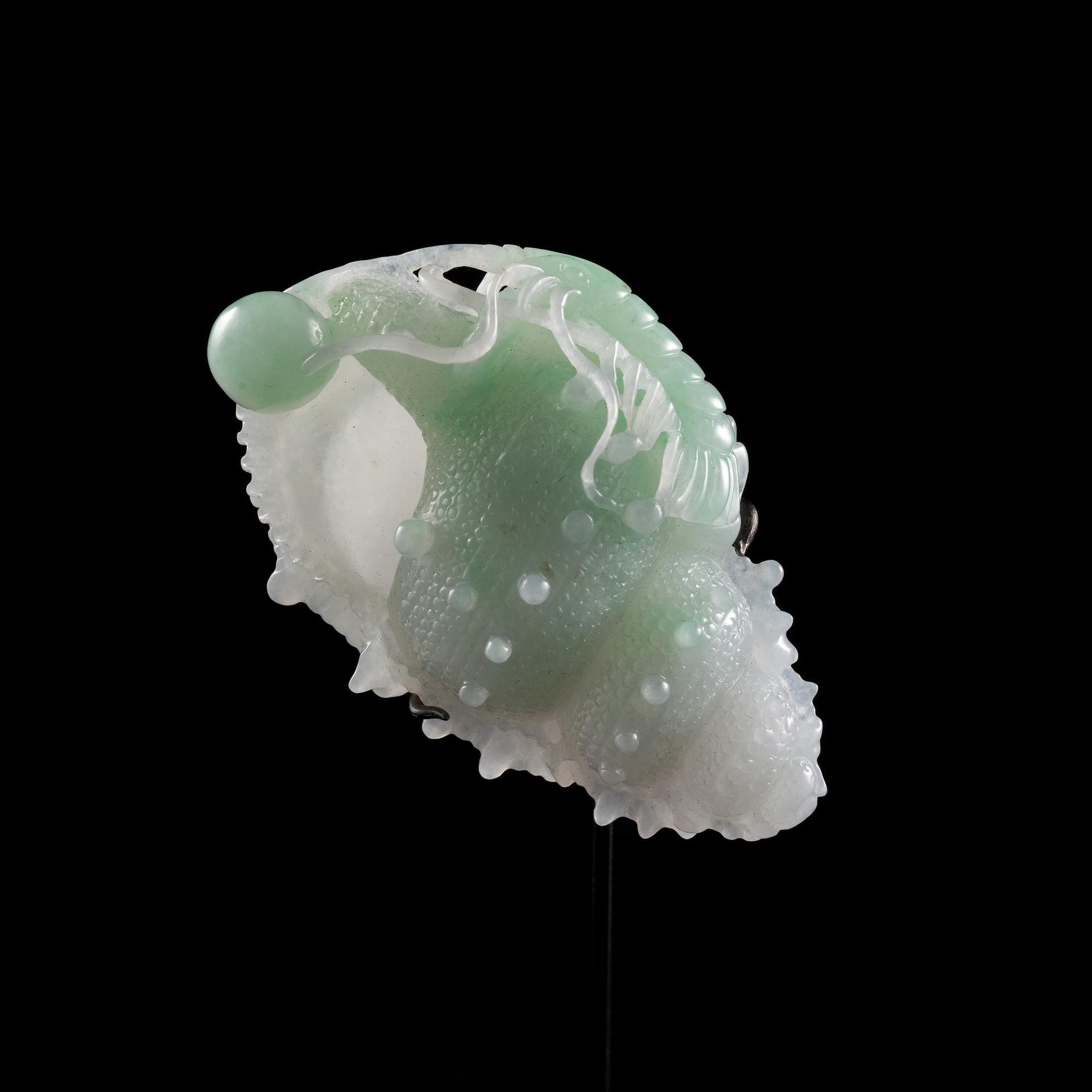 貝殼形制,內蘊著財富、護佑與幸福的意涵,是備受喜愛的吉祥信物。以堅硬的翡翠質地,細細琢磨出面目各異的貝殼,除了豐富的玉色變化,雕作的刀筆細節,更是值得反覆品翫。例如,貝殼殼身的紋路,花形的、曲線形的、點狀的、環狀的等等,都考驗著作玉之人的創意與手藝;再者,殼內的掏膛,以及將殼身呈現為薄透的過程,更是難度甚高的工夫,那是時間的長久積累,更是精熟於翡翠玉材特性與玉作技藝工夫之人,方能操持得宜。