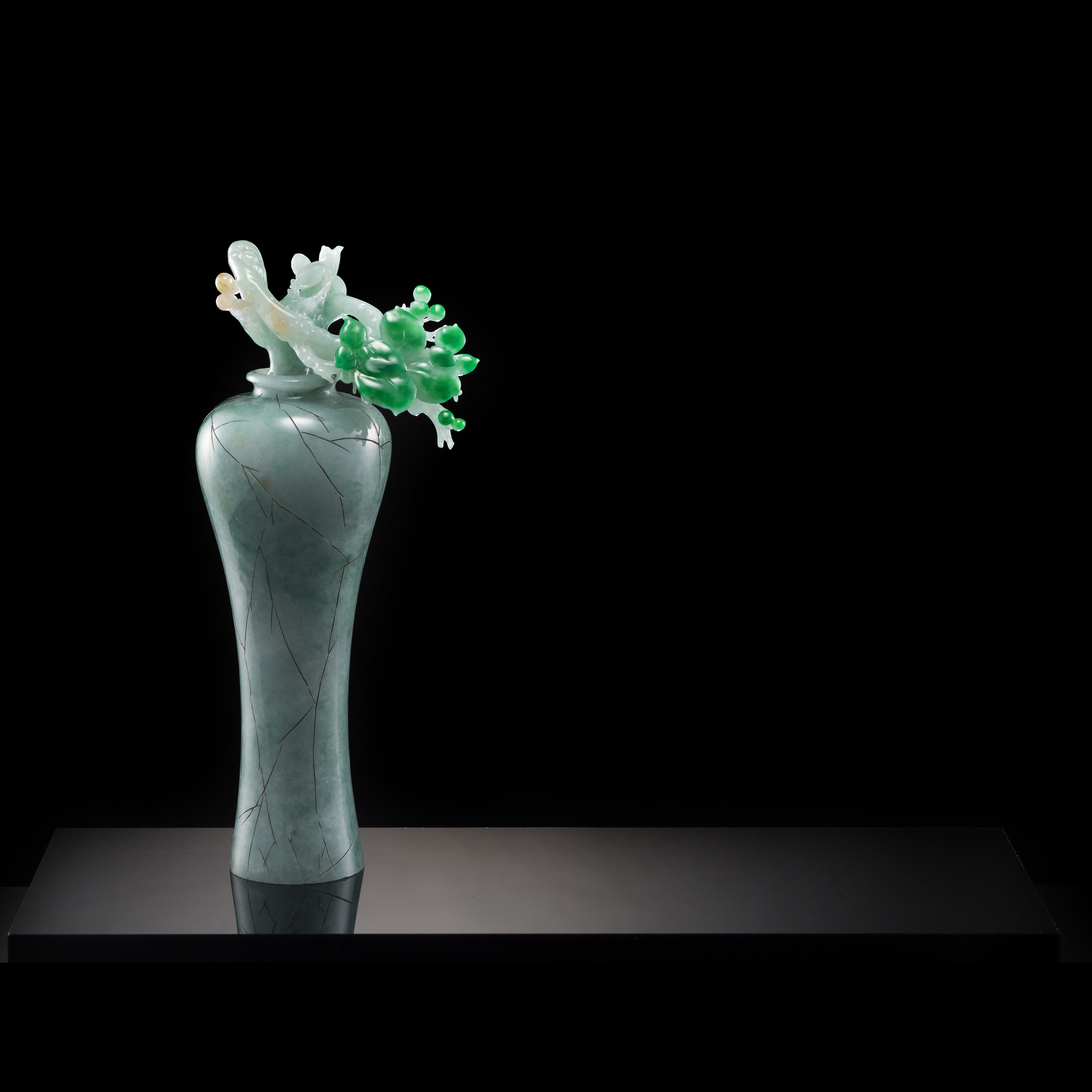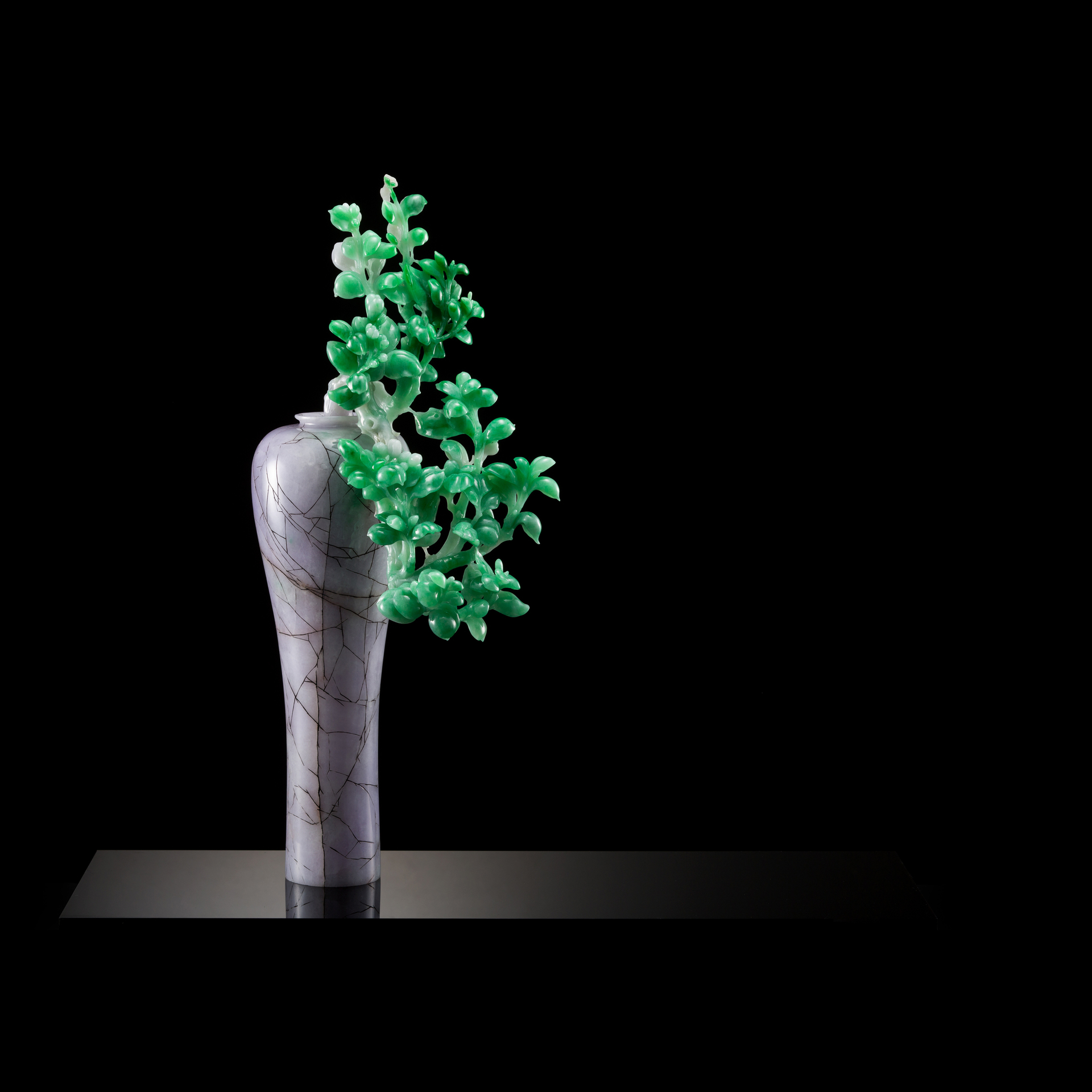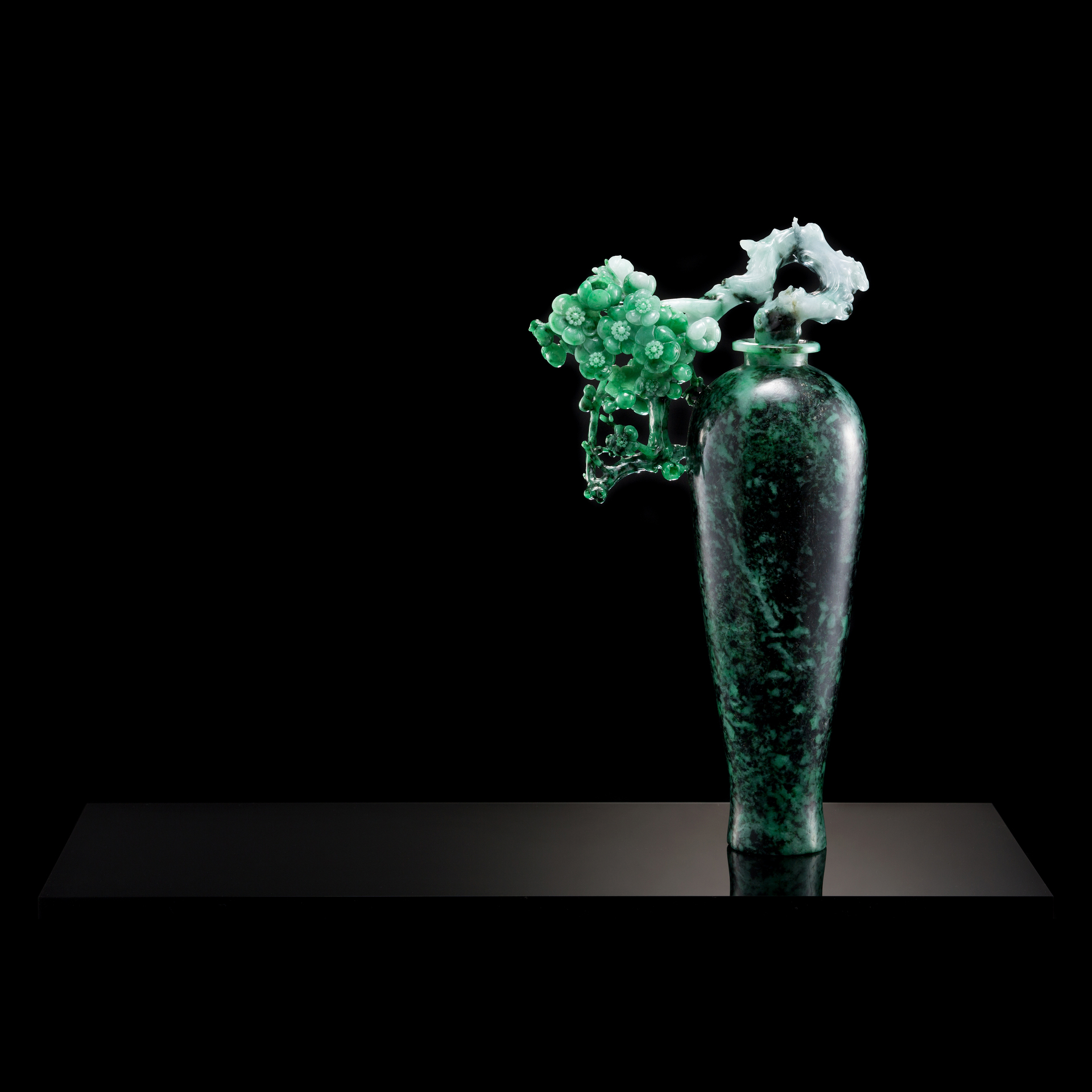 「梅瓶」,做為雕件的主題,通常會與「梅」兩相搭配,施以刀筆之際,梅瓶瓶身的優雅線條,尤為引人注目,曲線比例的拿捏,甚為重要,稍有差池,都將會影響整體的意境表現;而梅的施作手藝,則特別會著重於它的氣韻與格調,梅花的含苞或盛開、梅枝的曲折或遒勁,以及疏密布局的安排等等,皆是再三思量的重點。