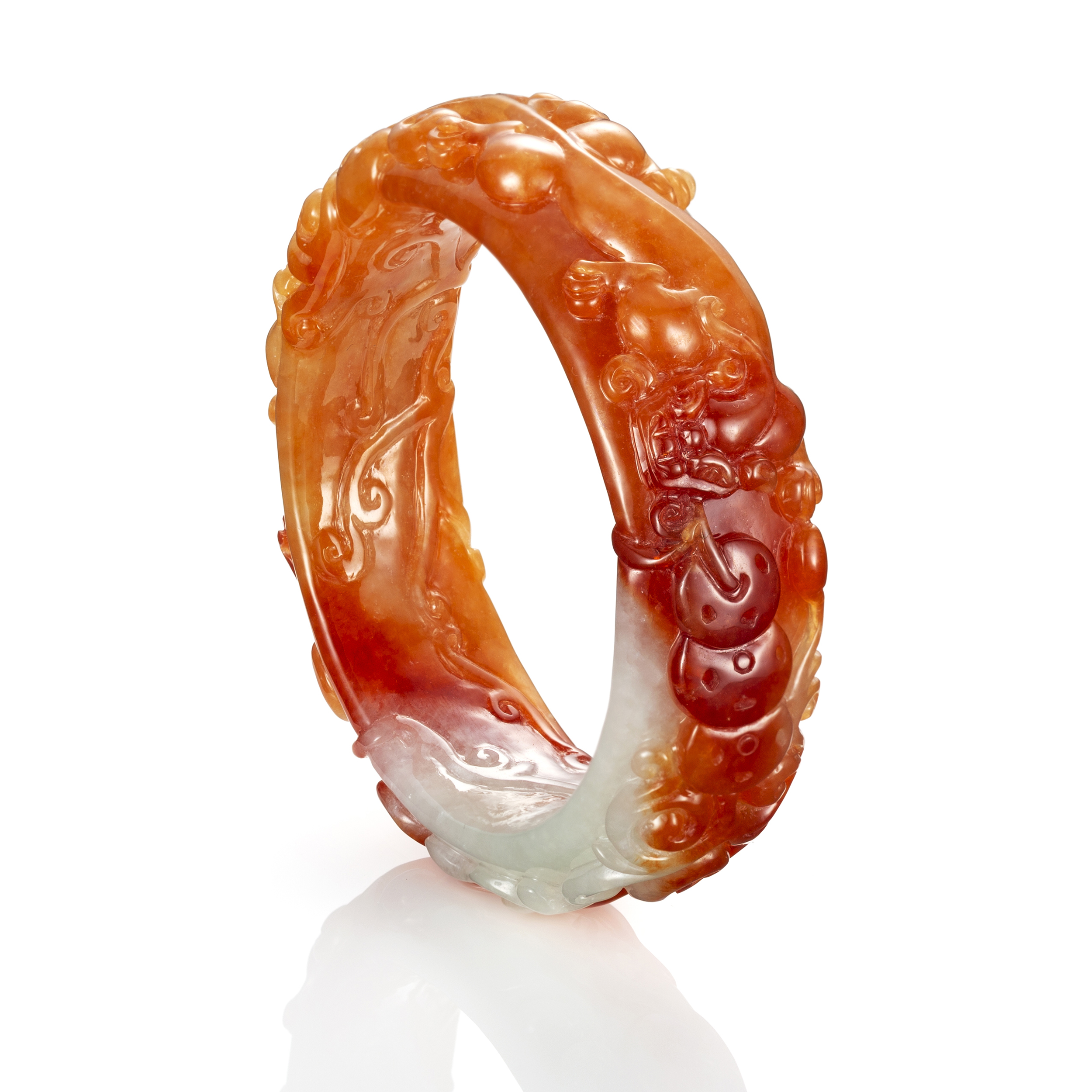以玉鐲的鐲面觀之,最常見的,即是平滑光素的鐲面,這也是最經典的造型。除此之外,有些鐲面,琢以菱紋,原本平滑的鐲面,化作細細小小的幾何圖樣,別具個性;或巧琢為竹節,有古典風情,透散靜謐內涵的氣韻;或琢為麻花狀,尤能表現工藝之美;而在寬版式的鐲面上,則有更豐富的刀筆設計,祥瑞圖紋,刻劃其間,寓旨明確,含蘊美好的祝願。