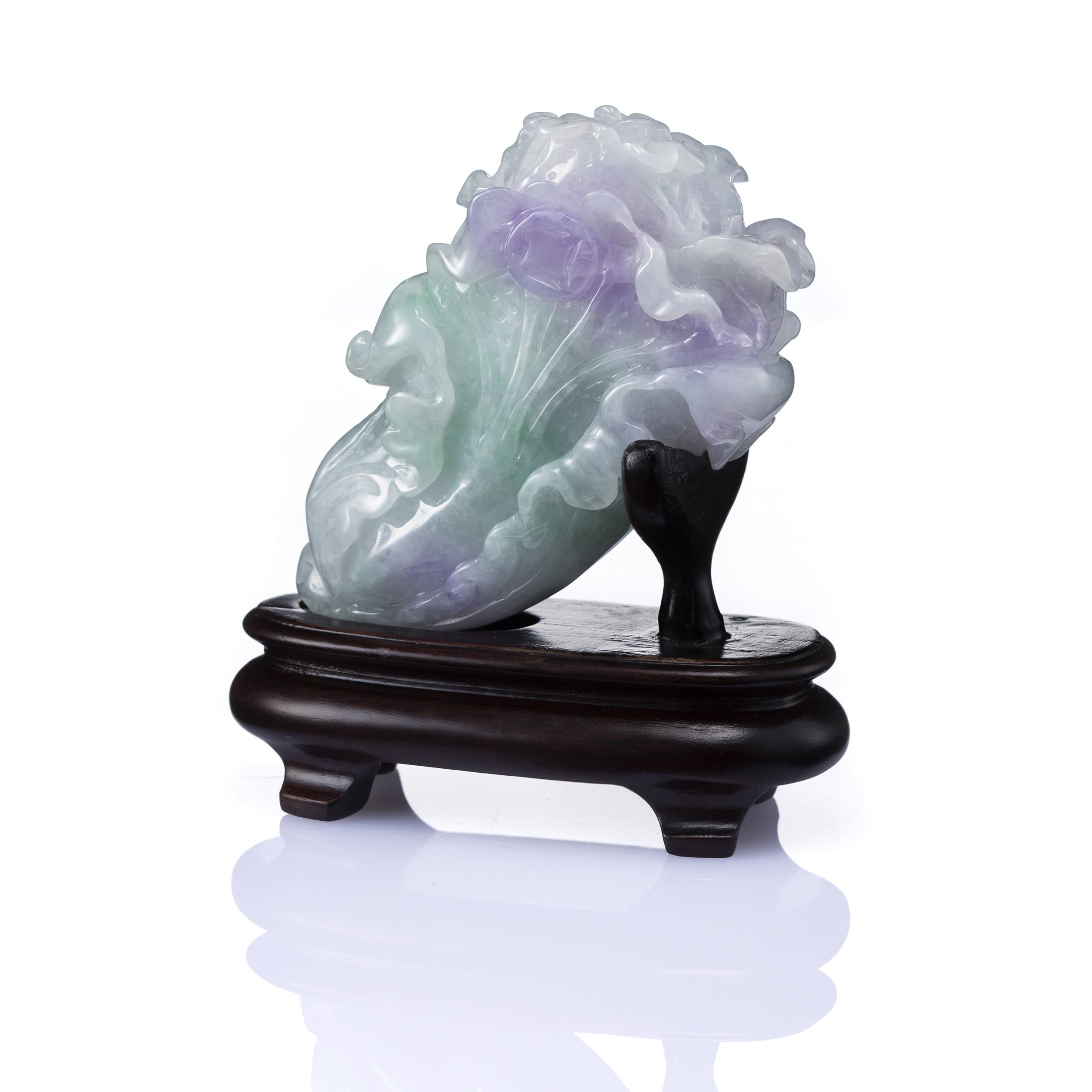玉世家的翠玉白菜,以溫潤清瑩的翡翠玉材巧琢而成。白菜,為清白純潔之徵,又諧音「百財」,以美玉雕之,更得「遇百財」的寓意。白菜的葉身紋路及其捲曲之態,細膩優雅,生機盎盎,深蘊著甜美的利祿幸福。