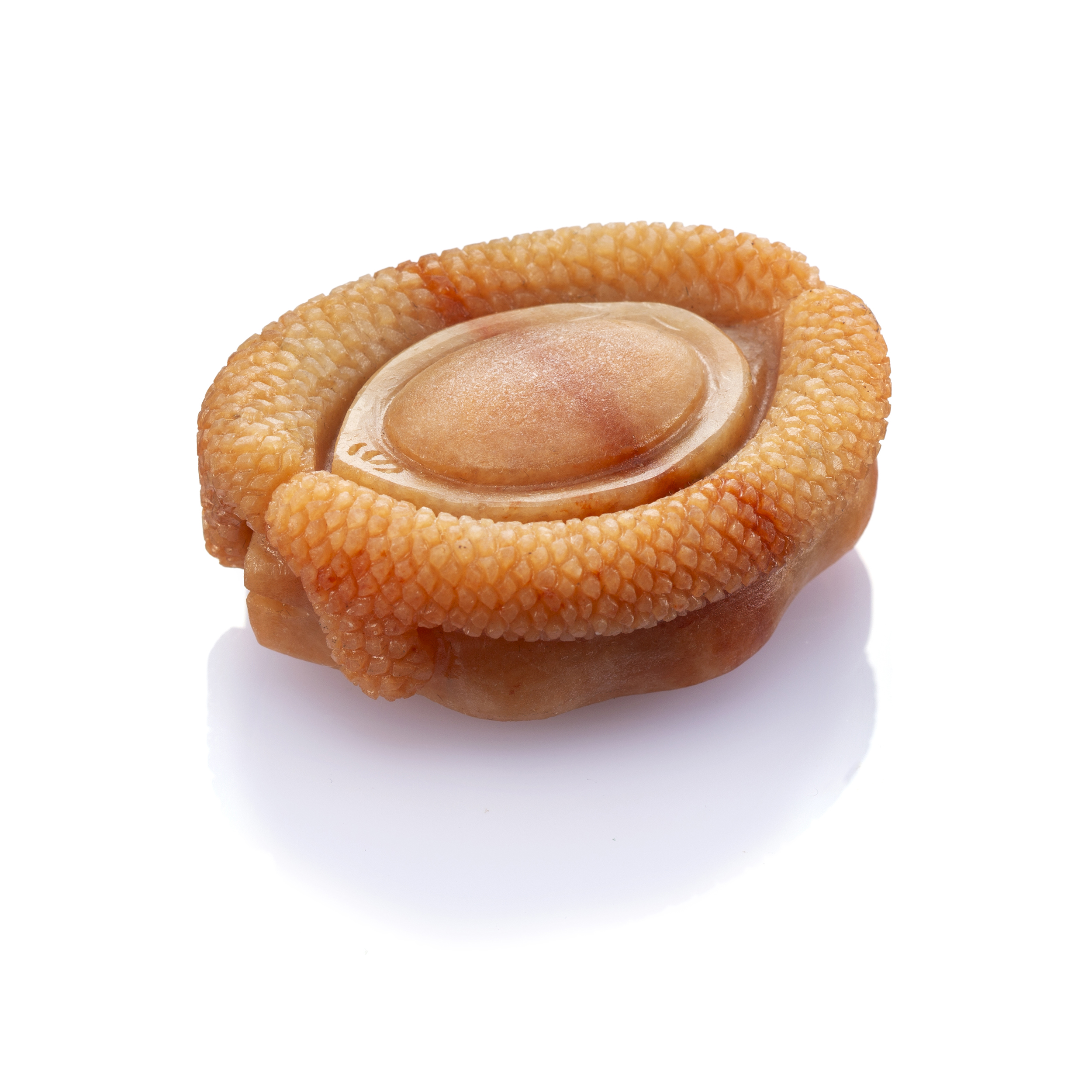 亦有豐盈飽滿的鮑魚珍饈。紅翡玉質,溫瑩古潤,翠色灼灼如焰,赤豔的精彩,最能捎來吉慶喜瑞,以寫實刻劃之刀筆,巧琢為鮑魚,寄寓富貴鴻運,年年有餘。