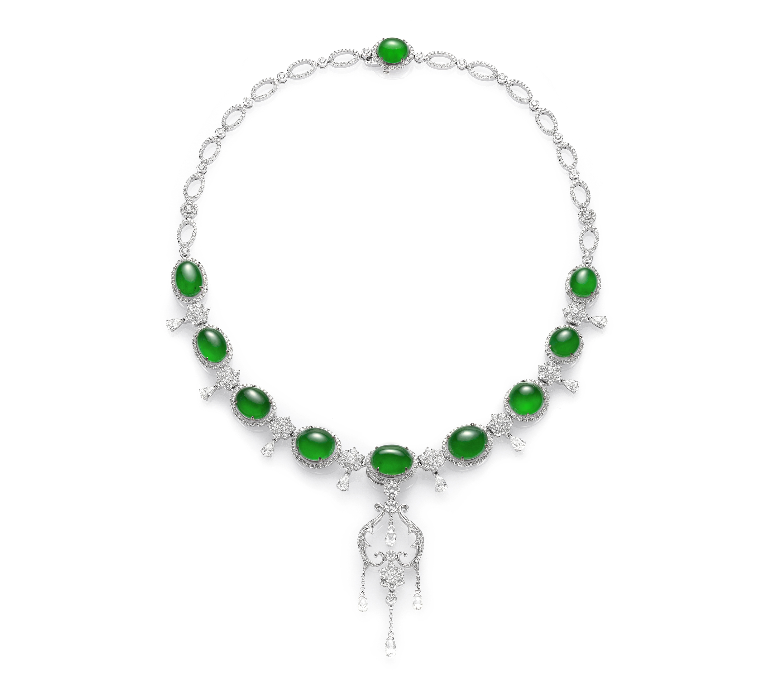 由JADEGIA玉世家所典藏設計的這套頂級翡翠珠寶套組,即是以頂級翡翠玉料為主石,玻璃種質地,溫潤勻透,經典的蛋面造型,將水漾靈動的通透綠意完美釋放,在同樣是極品鑽石的襯映之中,盡顯皇家風範,設計風格更巧妙融入古典歐式圖徽意象,比例分明,工藝細膩精湛,熠熠生姿著一場傾城風華。