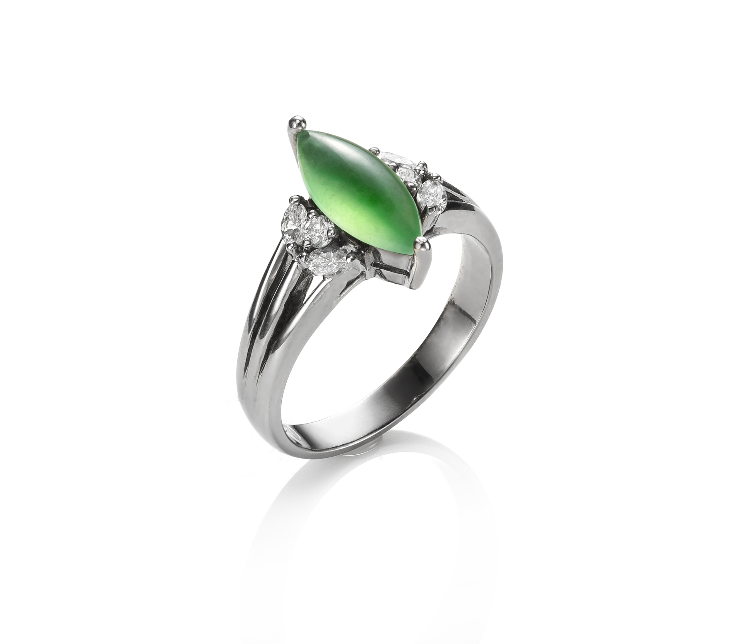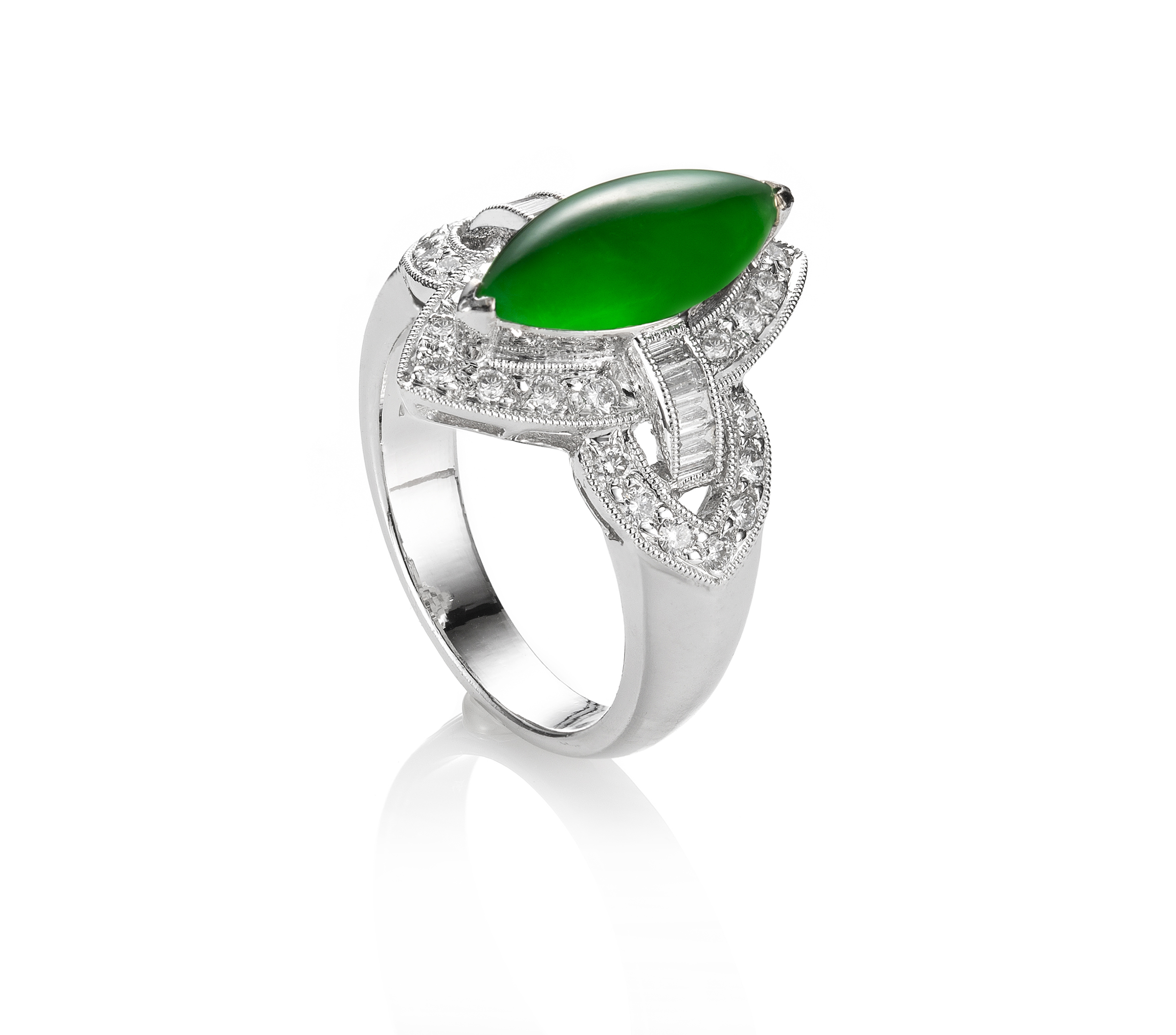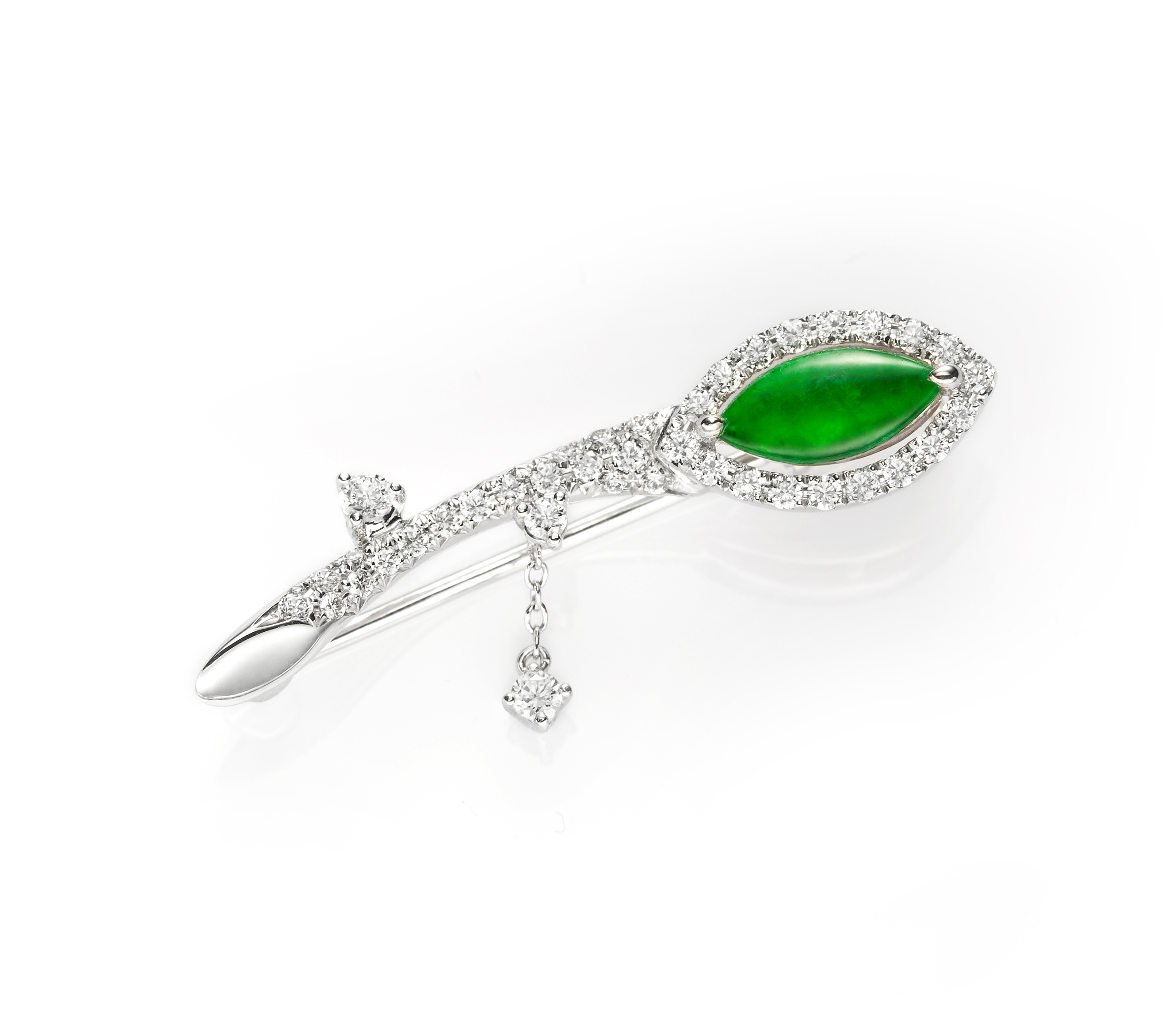 JADEGIA玉世家馬眼形翡翠珠寶系列,乍見,有綠葉初萌的喜悅感,揭示著大自然的氣息,滿蘊無限契機,而細細品究之間,翡翠的溫潤質地,馬眼形色的豐燦意象,以及設計與鑲嵌的諸般用心之處,則能見出富含底蘊的時尚風格。