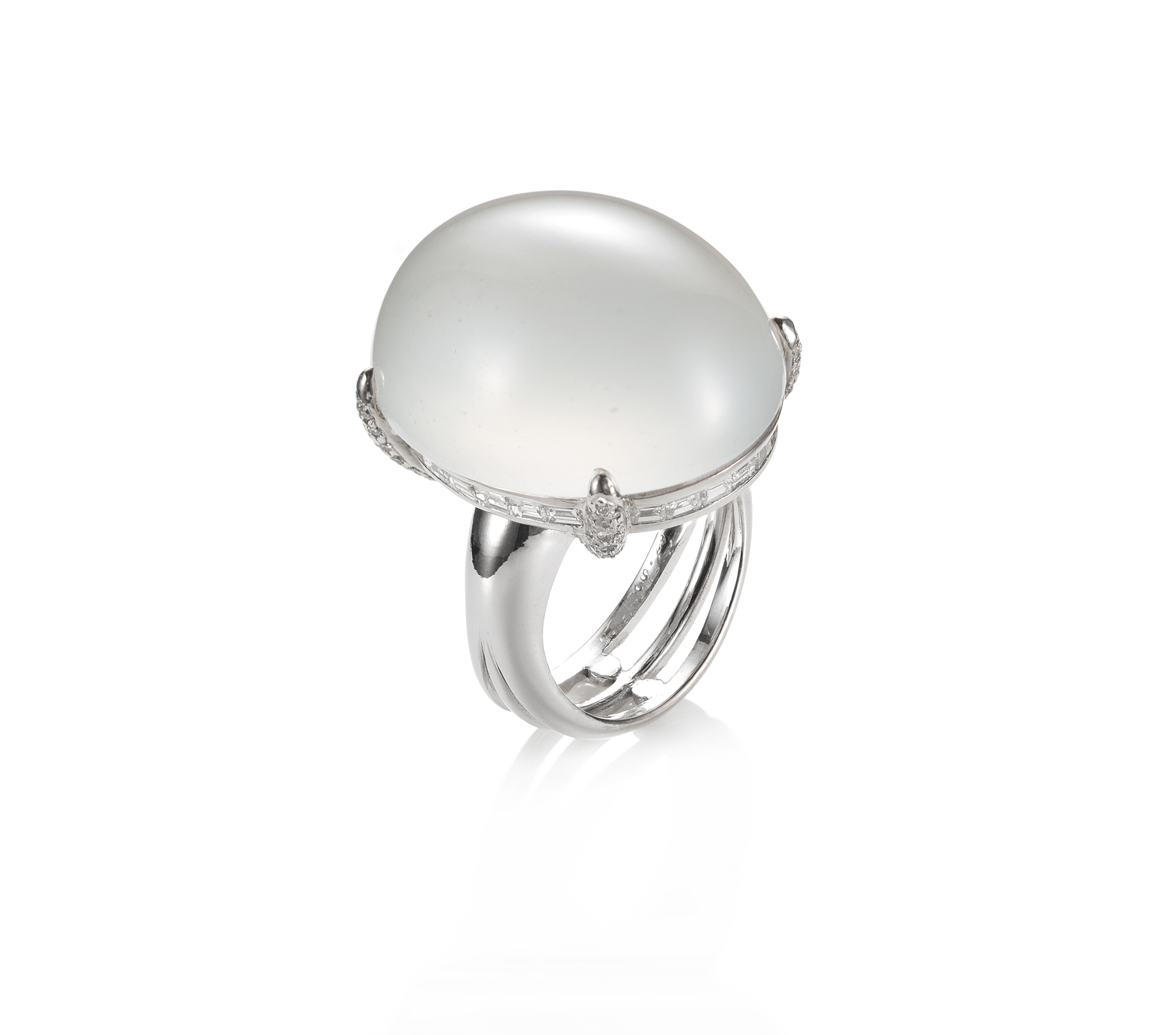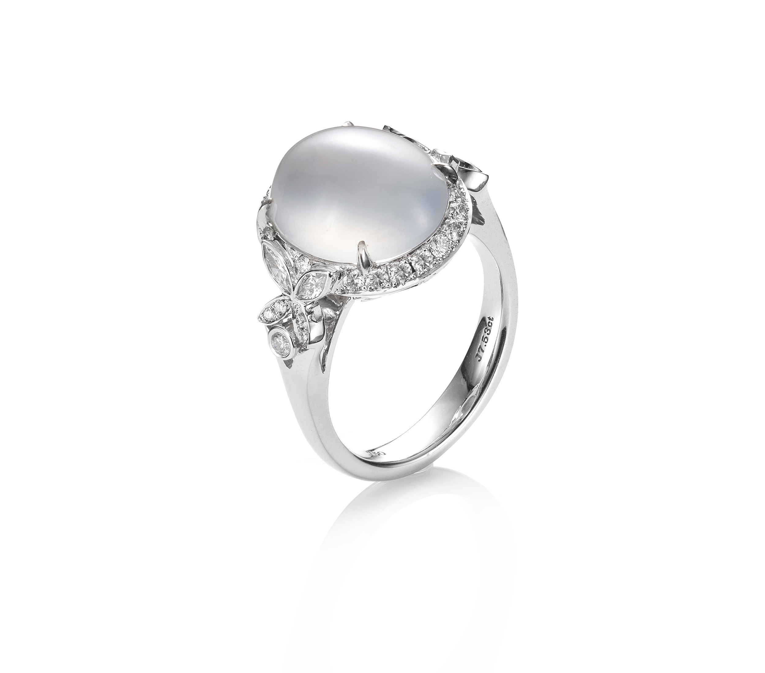 白色翡翠,質地清透似雪,玉色澄淨無瑕,象徵著純潔、高貴與優雅,經典的蛋面造型,薈萃溫潤玉光,不凡的韻致,有別於千篇一律的婚禮珠寶主調,以典雅脫俗的品味,點出美的真諦。