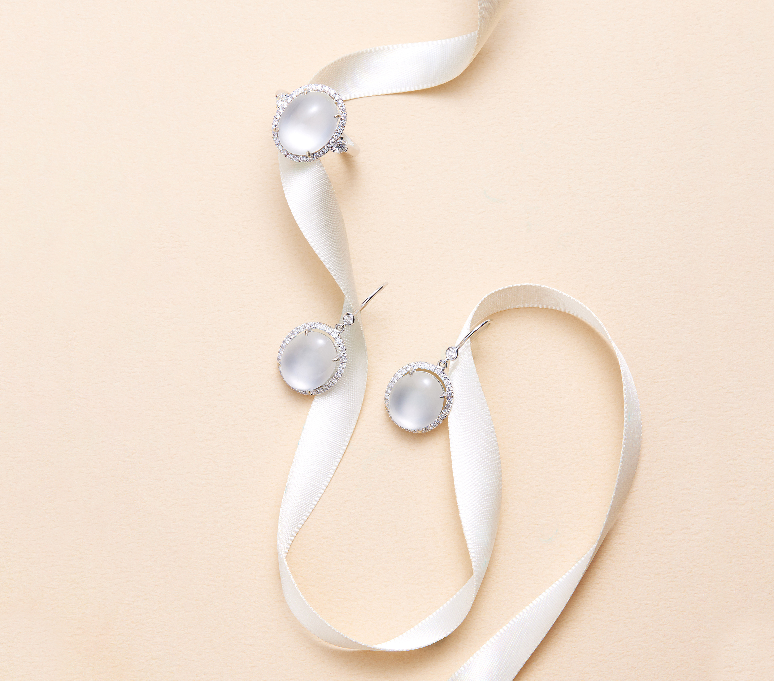 白翡婚禮珠寶系列,以戒指與耳環為主要款式,選用蛋面白翡為主石,融合不同的設計思維,有分量感十足的經典大蛋面,展現雍容大度的非凡氣質,亦有玲瓏小蛋面,聚攏為花之盛綻,清靈又嬌俏,格外的秀麗漂亮。