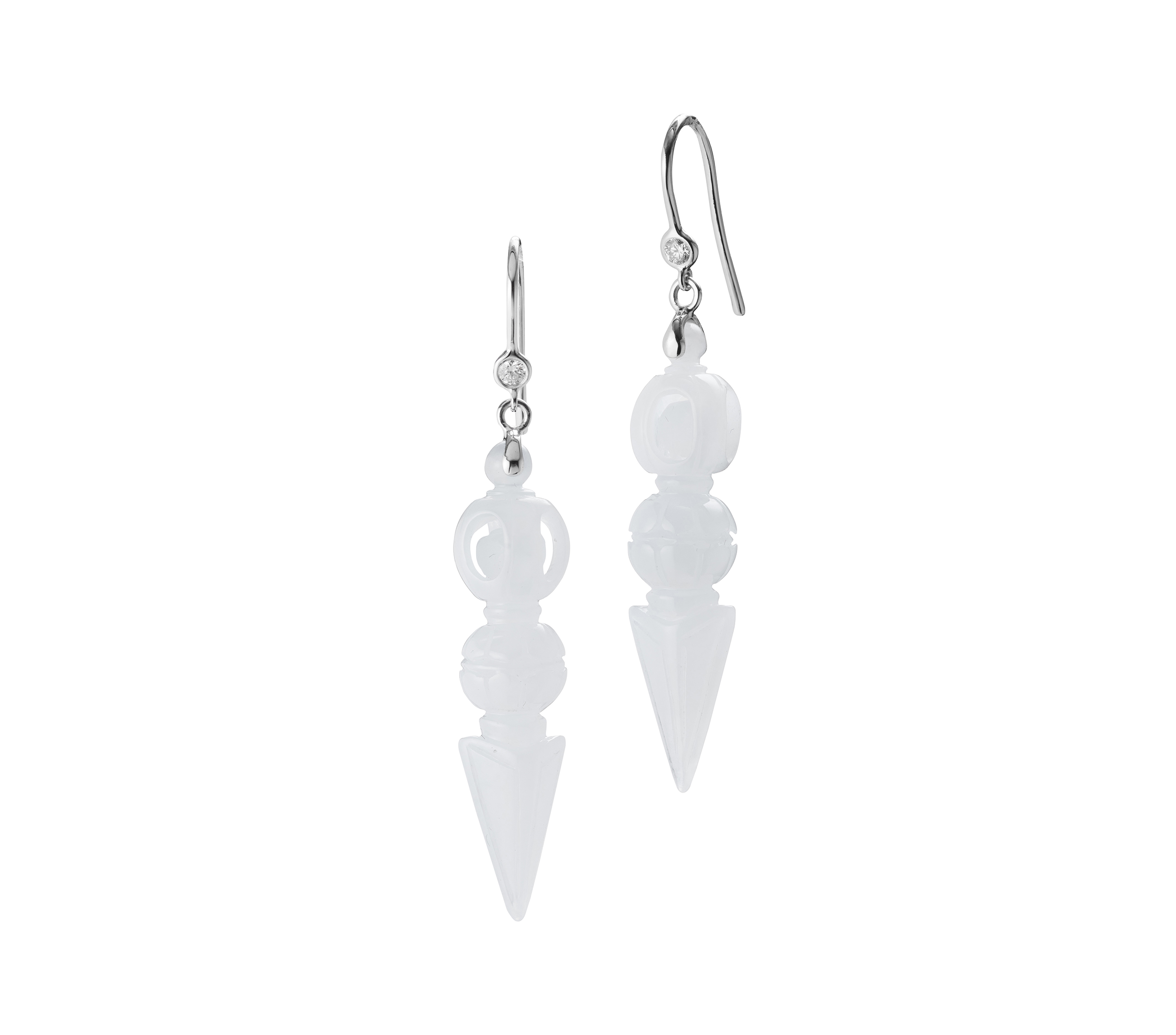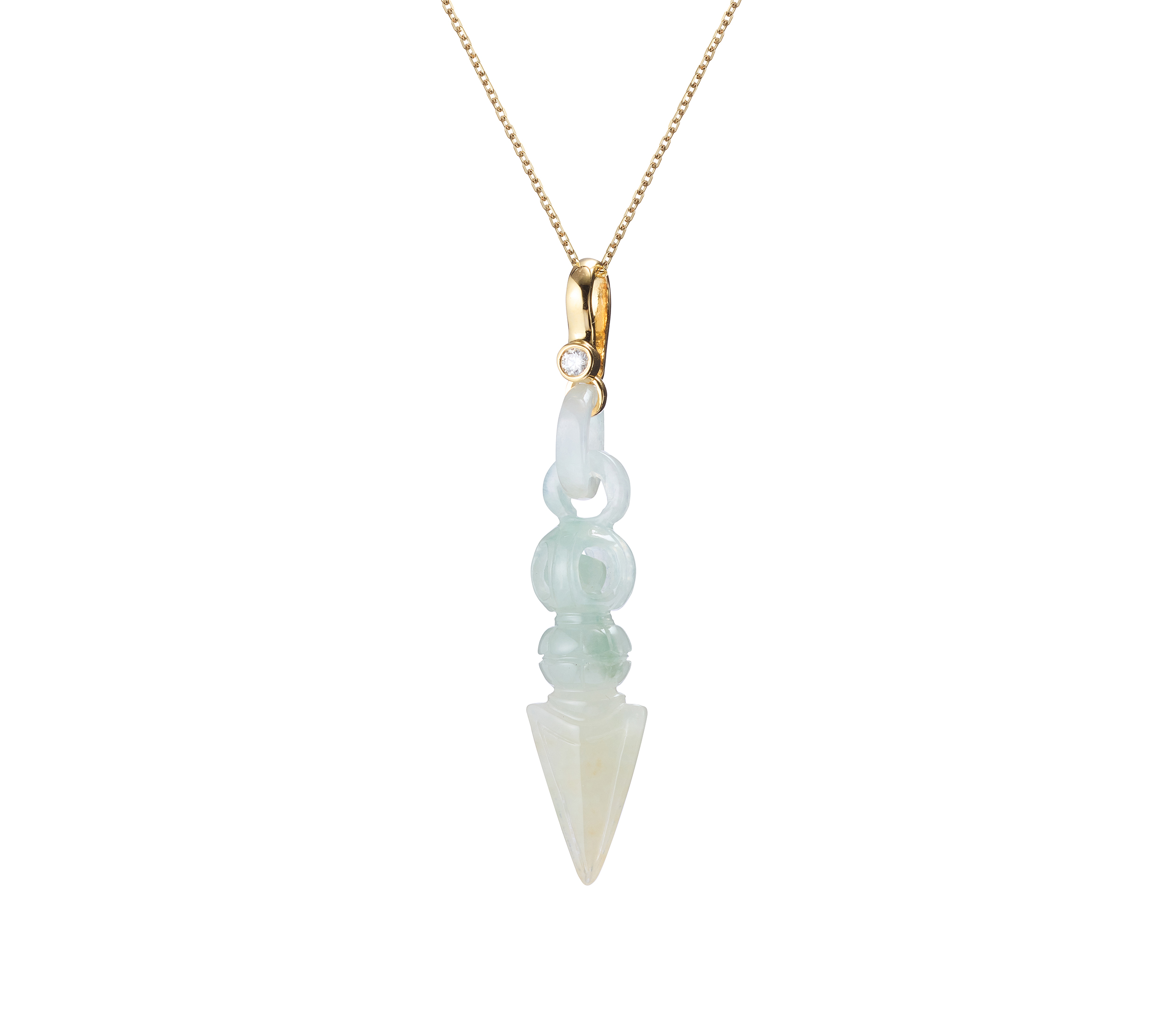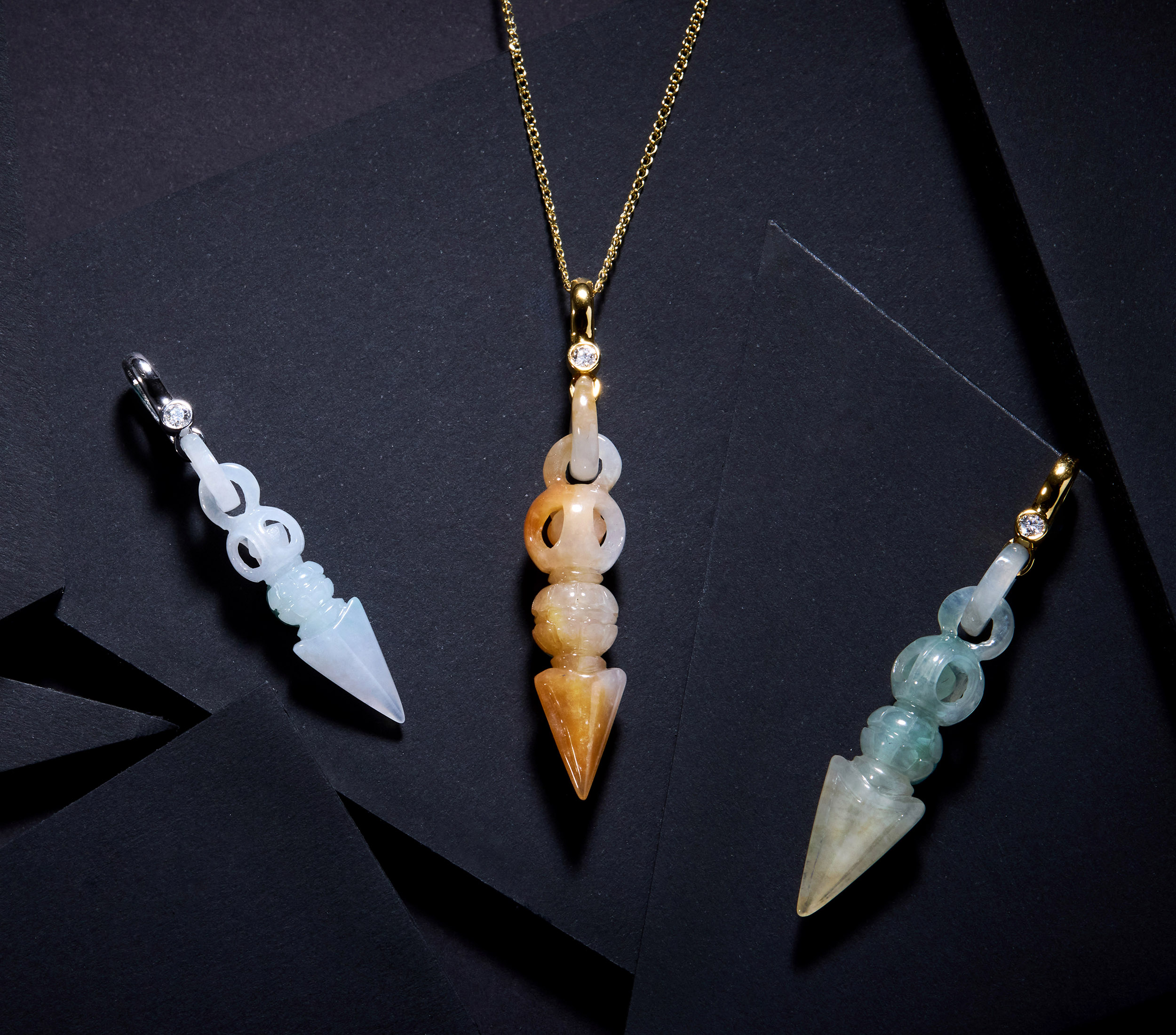 坊間常見的金剛杵與金剛橛配飾,多為銀製。JADEGIA玉世家以此二者為設計靈思,採用翡翠玉材來雕作為時尚飾物,珍貴的翡翠,硬度甚高,雕琢不易,此系列結合圓雕與透雕等玉作手藝,呈現玉環、蓮華、錐狀物之造型,層次分明,比例合度,工法細膩繁複,再襯以美鑽,透顯出難得的時尚感與人文性。