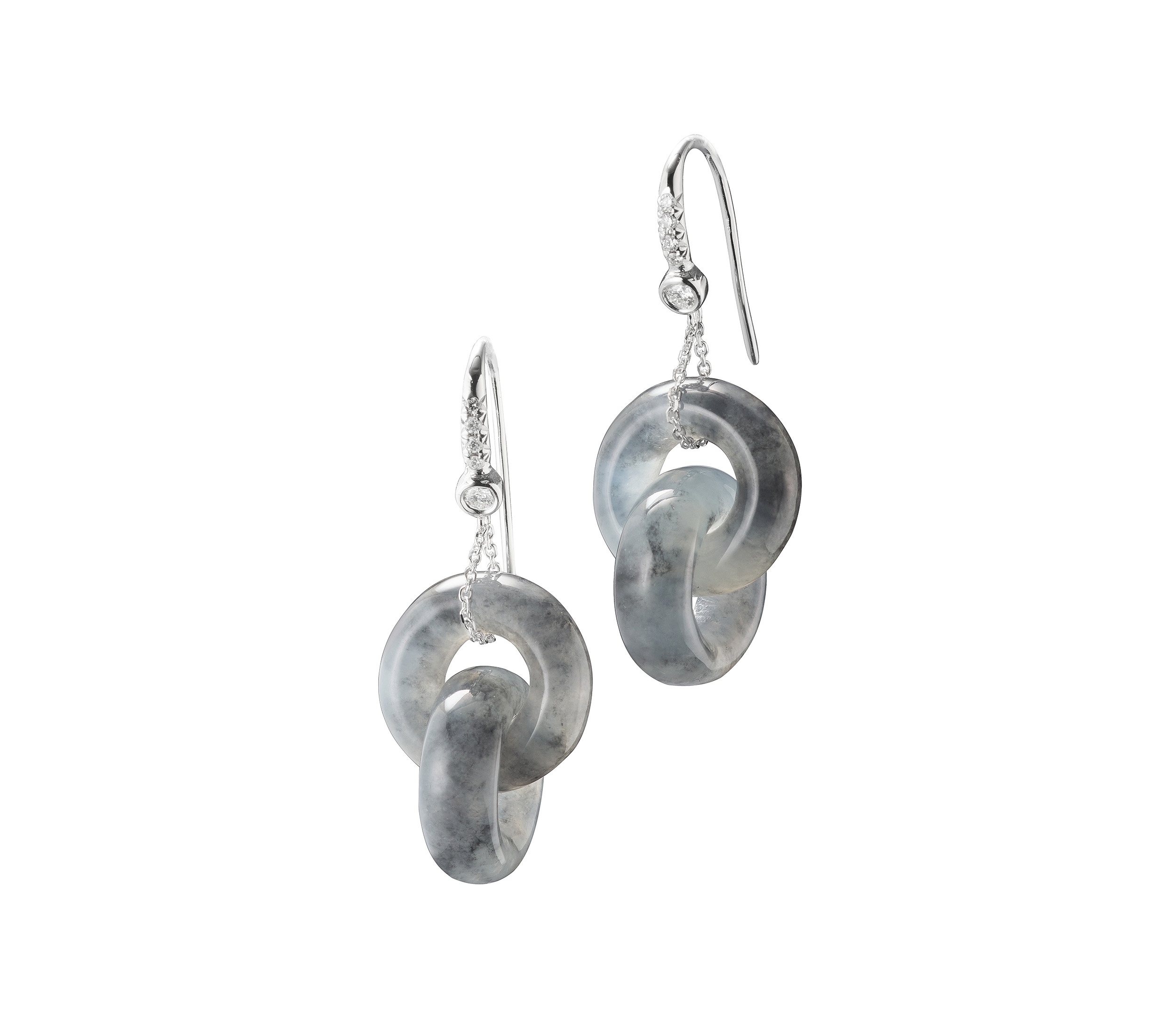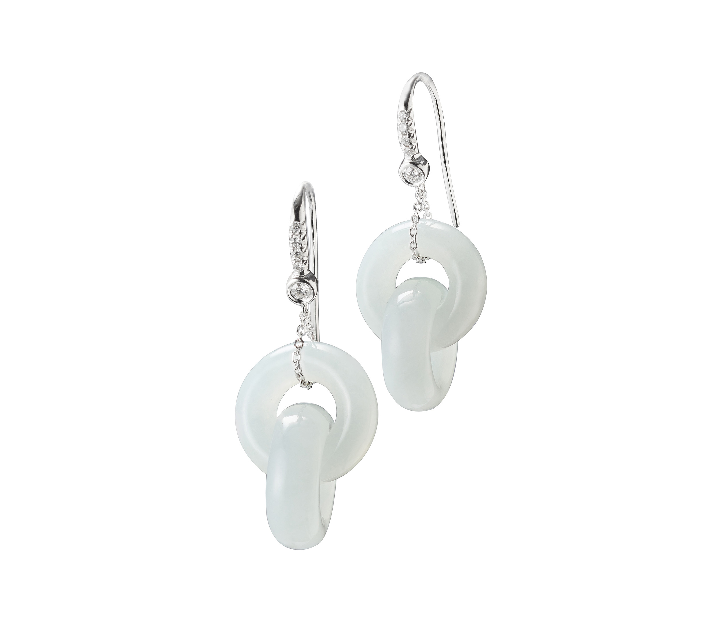 【清韻】系列,是雙連環形制的翡翠耳墜,玉材色系以綠、紅、白、黑四色為主,綠翠華貴,紅翡喜慶,白翡清靈,墨玉幽邃,不同玉色,透露著不同個性品味,既具東方古典韻致,亦同時展現時尚設計感。