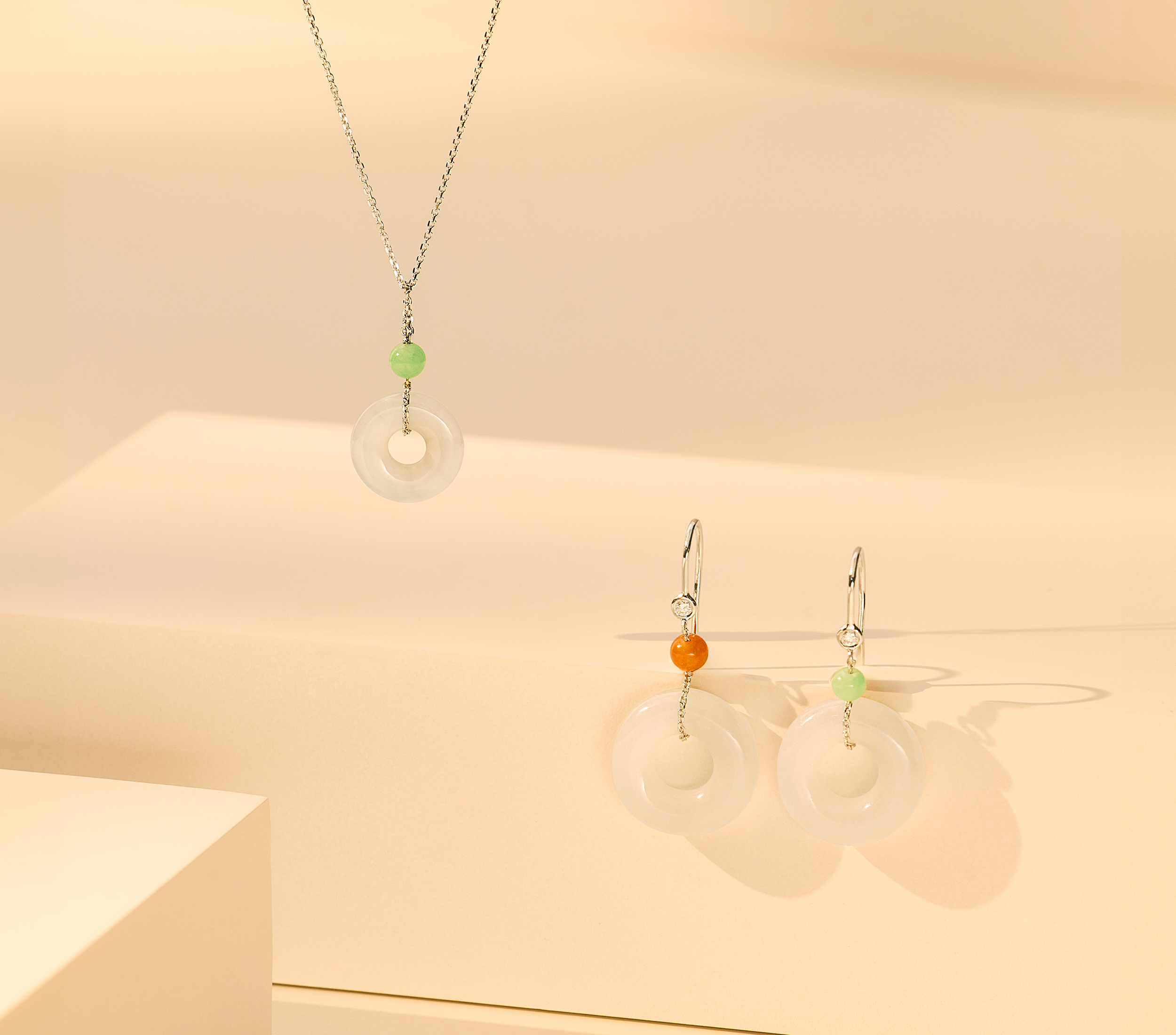 【小團圓】系列涵蓋墜飾與耳環等款式。JADEGIA玉世家設計團隊以經典圓環造型為靈感核心,選用白翡主石,並點綴綠翠或紅翡小圓珠,透過精緻比例與配色,形成柔和而富有層次的視覺對比。