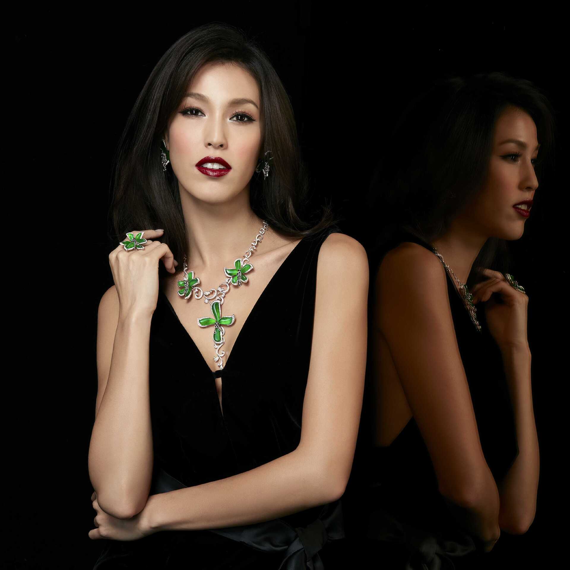 外型兼具東方優雅及西方個性的Akemi,不同於春夏形象廣告中展現陽光燦爛的笑容,這次她以低調華貴的態度嬌媚詮釋,正如作品名稱【花神】,於冬日盛開的花兒,必定更加堅毅挺拔、清靈有神,濃艷碧綠的頂級老坑玻璃種翡翠,水頭清盈柔潤,實屬難得一見,襯在肌膚上的朵朵花瓣,透可見光,舒展之姿,顯露出不同的個性,以獨特立體切割及鑲嵌方式,演繹出花朵靈動的生命力,繚繞在頸項、耳畔與指間,皆映現無比優雅的氣韻,完美襯托頂級翡翠東西融合的設計概念與時尚姿態。