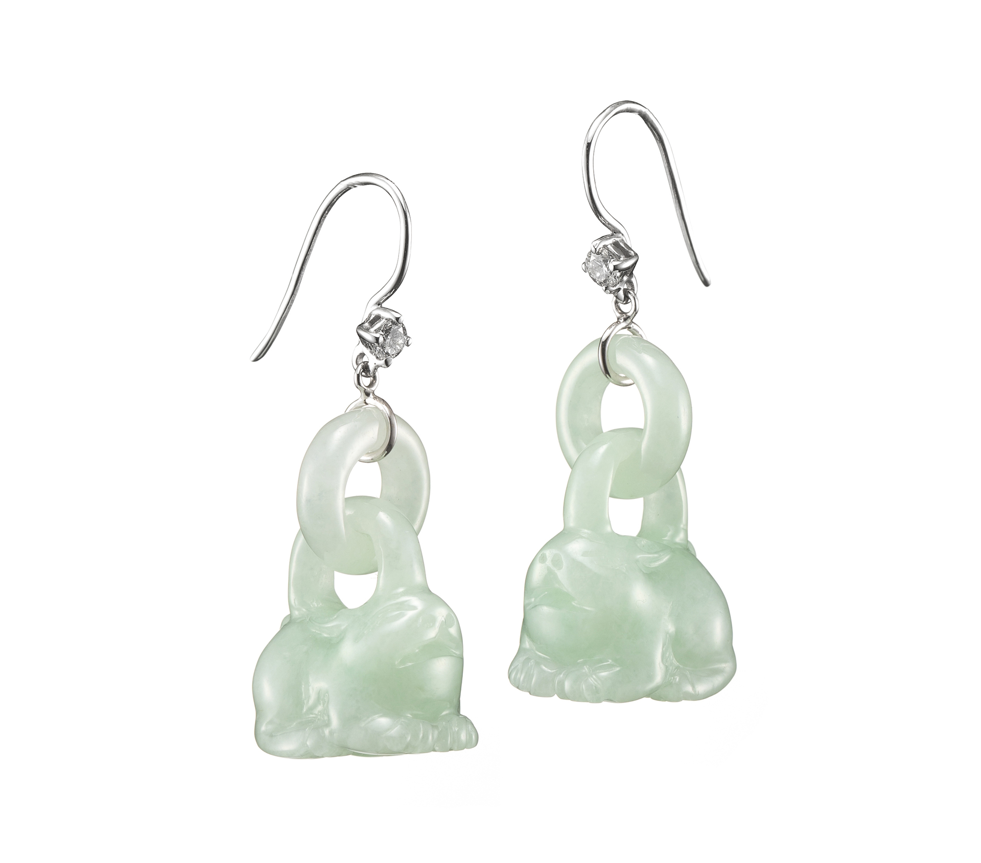 設計師以傳統圓滿意念為基礎,將璧、環與古錢的造型融入於珠寶設計,運用不同的翡翠色澤、異材質珠寶的搭配,琢磨為深具古典韻致的戒指與耳環。另有一款環形交串的玉兔耳墜,將傳統主題做了輕盈的演繹,並結合月中玉兔的形象,展現出俏麗可愛的氣質。
