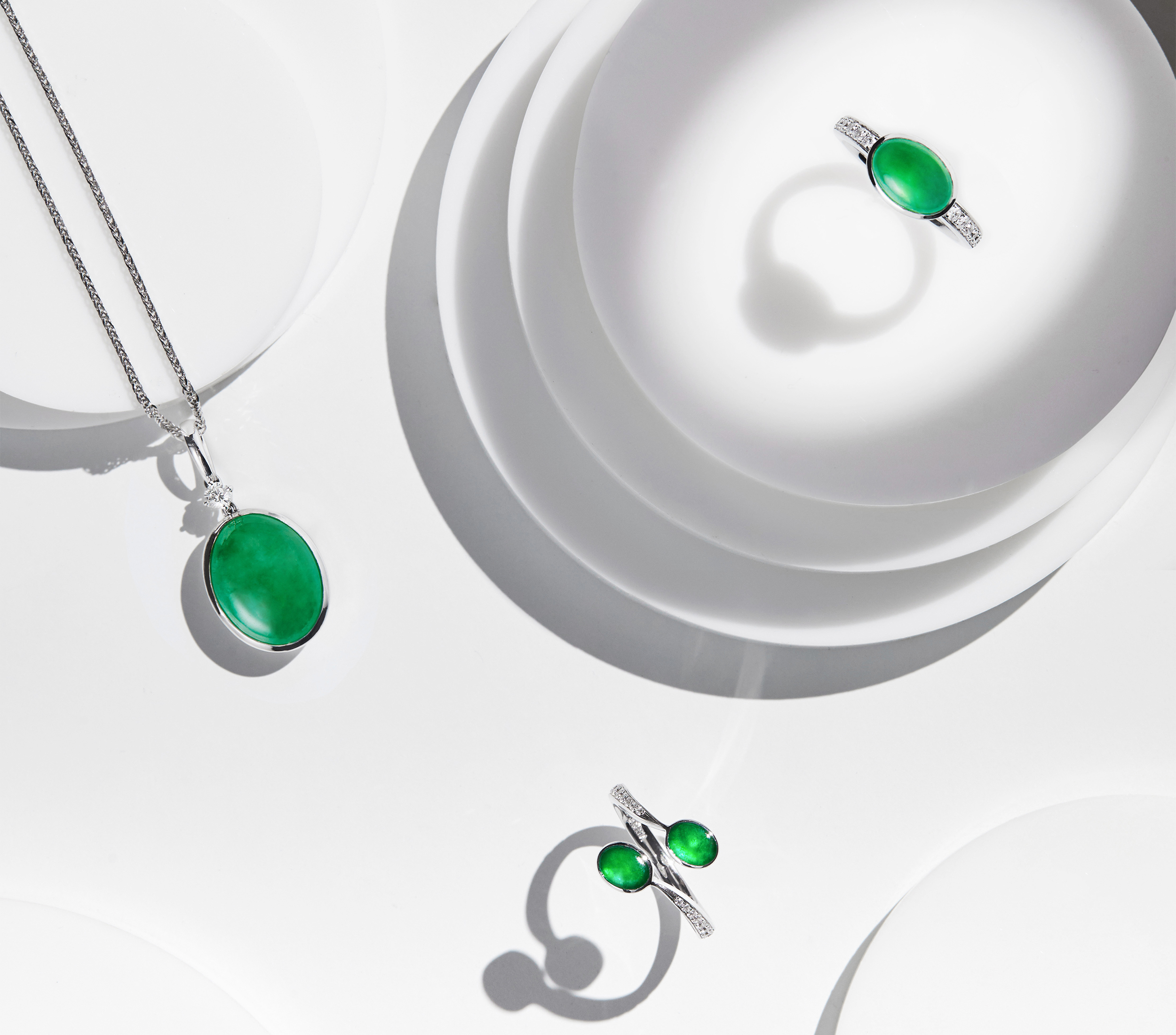 JADEGIA玉世家春夏珠寶款,在翡翠的純色面目之中,呈顯簡約,詮釋出「原來」、「本色」的設計美學。
