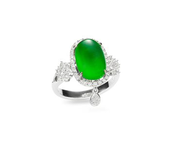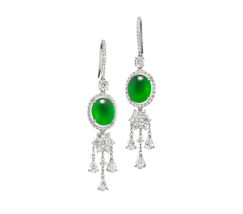 頂級翡翠珠寶套組,款式包括套鍊、戒指與耳環。玻璃種蛋面翡翠鑲鑽套鍊,主石質地勻潤,色澤濃綠,美得靈性迷人,搭配圓形與梨形鑽石,氣韻之優雅,令人屏息,設計與鑲嵌,細節分寸,皆拿捏得宜;同樣是玻璃種翡翠的蛋面鑲鑽戒指,同樣搭配著圓形與梨形鑽飾,兩相交映,更加映襯了玉色的精采與深度;而蛋面翡翠鑲鑽垂墜耳環,玻璃種主石,質色靜謐溫柔,襯著鑽石的燦燦光亮,搖曳閃動著嫻雅的氣質。