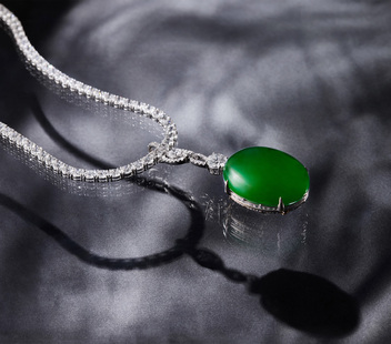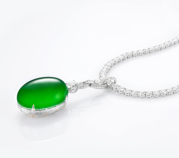 此款蛋面翡翠鑲鑽墜飾,以頂級玉材為主石,翠影玉光之間,呈顯著純粹的美,純粹的靜好,搭配璀璨的鑽石,襯托出大器雍容的氣度,它彰顯著珠寶工藝的極致,也詮釋了美的深度與高度。