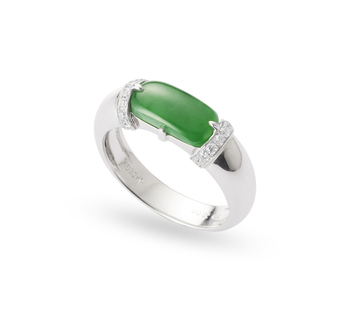 青盈的綠翠,彷彿在玉光中藏有信息,傳述著寧靜的愛與智慧。主石兩側,飾以環形鑲嵌,鑽石燦然點襯,戒身線條,簡潔流暢,俐落有型。