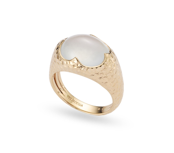 白翡蛋面,清透有光,戒身的設計,頗具歐風,大器優雅,展現古典韻致,戒身有凹紋,細細密密的凹紋,純由手工敲琢而成,每一道凹紋,都含藏著時間與工藝的精華,也像極了愛情,點點滴滴,琢磨鑄造,淬出了真正的最愛。