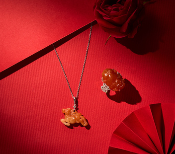 此系列節慶珠寶,主題多樣,其中,有以生肖年為主題的駿馬墜飾,討喜的紅翡玉色,雕作一馬當先的飛奔姿態,寓意「馬上有喜」,十分年輕有活力;亦有以貔貅、葫蘆、懷古等祥瑞圖騰為主題。另有經典蛋面造型,玉光薈萃之中,象徵著圓滿與幸福。