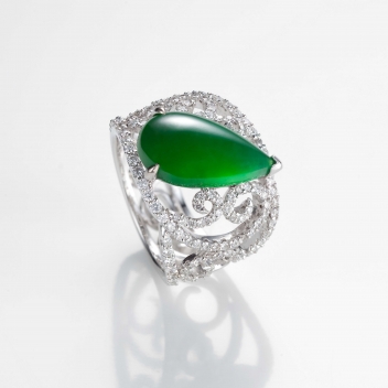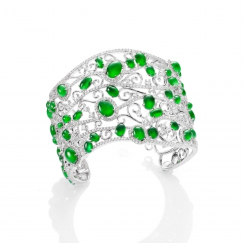 而當維多利亞風格遇上翡翠的內斂貴氣會擦出何等精彩火花?JADEGIA玉世家巧妙融合了東西方的古典情懷,精彩詮釋出不同凡響的珠寶樣貌。一只優雅手鍔透過捲曲弧線托住一顆顆宛若清晨露珠般的蛋面翡翠,輕柔盤繞在手腕間,流露瑩透碧綠的清新優雅;又或如荷葉領飾般的古錢造型翡翠鑲鑽套鍊,輔以亮鑽、紅寶石與藍寶石,勾勒出曼妙舞動姿態;另一枚寬版戒指則以蕾絲般纏繞的鑽飾線條,簇擁著濃綠飽滿的水滴形翡翠圈於指尖。每件作品皆以繁複細膩的工藝盡顯奢華浪漫,交織出瑰麗而典雅的時尚復古風采。