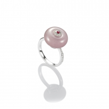 紫羅蘭翡翠又名「春帶彩」,不僅質地溫潤細緻、顏色淡雅浪漫,更蘊含著希望與憧憬的嶄新意象。【滿園春】結合翡翠與時尚的本質,在珠寶的設計細節方面,白K金線戒柔和而順暢的線條樣式,搭配圓形飽滿的紫羅蘭翡翠主石,相互映襯間散發出簡單優雅又獨特的新春之美,再嵌入紅寶石與鑽石點襯,更增添了璀璨、華貴的丰采!