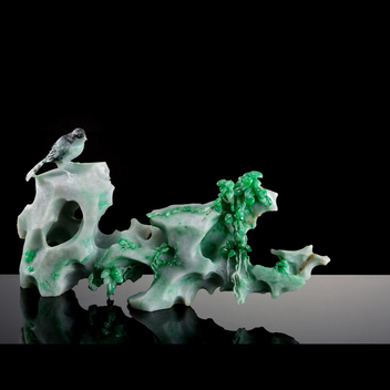 「道法自然」的意蘊,在於心領神會!「道」,它無法被語言文字所框限定義;而「自然」所指的也不僅是自然萬物,這裡的「自然」更是指「道」本身生生不息、規律流動的狀態。綜觀【道法自然】系列擺件作品,將如此意念化作翡翠藝境的視覺表現,每道刻劃、每個細節都考驗著雕作者的眼光與修為,無論古木姿態、崢嶸山石,或花顏鳥躍、亭閣人跡,世間景緻皆琢磨於翡翠玉石之中。