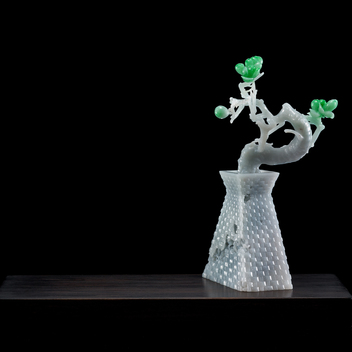翡翠,來自於天地之間,以天地自然之物雕作天地自然的變化,格外有令人心動的趣味!在翡翠雕刻的美學技藝中,【道法自然】系列作品是一場高難度的「俏色巧雕」實踐,雕作者巧妙運用翡翠的顏色、皮色以及紋理,融入創作題材中,以達到畫龍點睛的目的,此項技藝是玉石工藝特有的表現形式,更是極具難度的美學挑戰。「俏色巧雕」的關鍵在於選材與構思,由於每塊翡翠原石的形體各異,色脈多變,在有限的玉材條件中,必須仰賴雕作者的巧思,方能成就匠心獨具的作品。