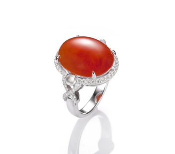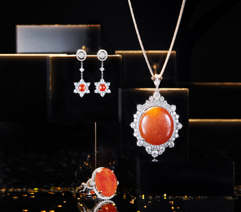 耶誕紅翡珠寶系列,設計有耳環、戒指與胸墜等款式。紅翡耳環,以嬌透紅豔的翡翠為主角,周圍嵌以白翡與鑽石,純淨與璀璨,宛如雪花澄澈,墜身比例適切,搖搖盪盪著浪漫與驚豔,紅與白的對比,別有視覺的立體層次之美;蛋面紅翡戒指,質色勻潤鮮麗,輔以燦亮的鑽飾,兩側點襯以白翡,交叉的設計線條,甚有舞動感,既華貴大器,又透著靈動的俏麗;紅翡墜飾,同樣以經典的蛋面造型,詮釋出如女王氣勢的丰采,璀亮鑽石烘托於旁,簡練設計之間,定位出了派對中備受注目的「嬌」點所在。