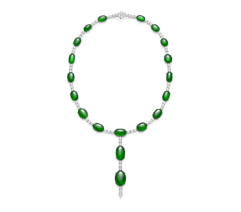 JADEGIA玉世家秋冬翡翠選品,以頂級的Y字形套鍊為主,搭配翡翠鑲鑽耳戒套組,完美詮釋女人的優雅風華。翡翠Y字形套鍊,嚴選19顆最高品級的老坑玻璃種蛋面翡翠,並輔以圓形和梨形鑽石,細膩鑲嵌之間,彷彿一場美的格律,比例勻稱,高貴大度,是令人歎服的雍容氣韻。