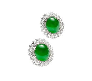 翡翠鑲鑽耳戒套組,亦是質地勻潤淨透的蛋面翡翠,輔以圓形鑽石鑲飾於主石周圍,猶如美的漣漪,層層波動,閃現出永恆的波光。