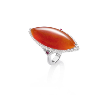 而簡約輕盈的項鍊、戒指與耳環則適合個性低調的女性。同樣以白翡和紅翡為主石,或單色呈現,或兩相配搭,不經意地就能獲得眾人視角。