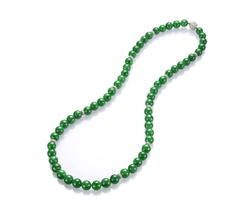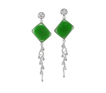 翡翠長珠串,以溫璨的玉珠相串,間以鑽飾相隔,雍容非常,典雅非常,在珠圓玉潤之間,最能透散華貴丰采;古錢造型的翡翠鑲鑽墜飾,象徵財富、圓滿的吉祥意涵,幣身如方寸碧茵,豐盈美好,搭配璀璨的鑽飾設計,典雅之中,亦見俏麗靈巧;馬眼形翡翠與蛋面冰種白翡鑲鑽墜飾,清秀可人,別有窈窕之美;三款戒指造型,亦各有風情,蛋面者內斂含光,方片寬版者有朗朗氣宇,三角造型者,則彷彿於指間揮毫出美的靈思,繞出了瀟灑的氣韻生動;兩款耳環,一為圓珠垂墜搭配鑽石與紅寶石,另一為方型翡翠鑲鑽垂墜,分別詮釋了不同的喜悅和清靈;至於蛋面冰種白翡鑲鑽手鍊,則映出了如雪的明淨,既秀靜,又俏麗。